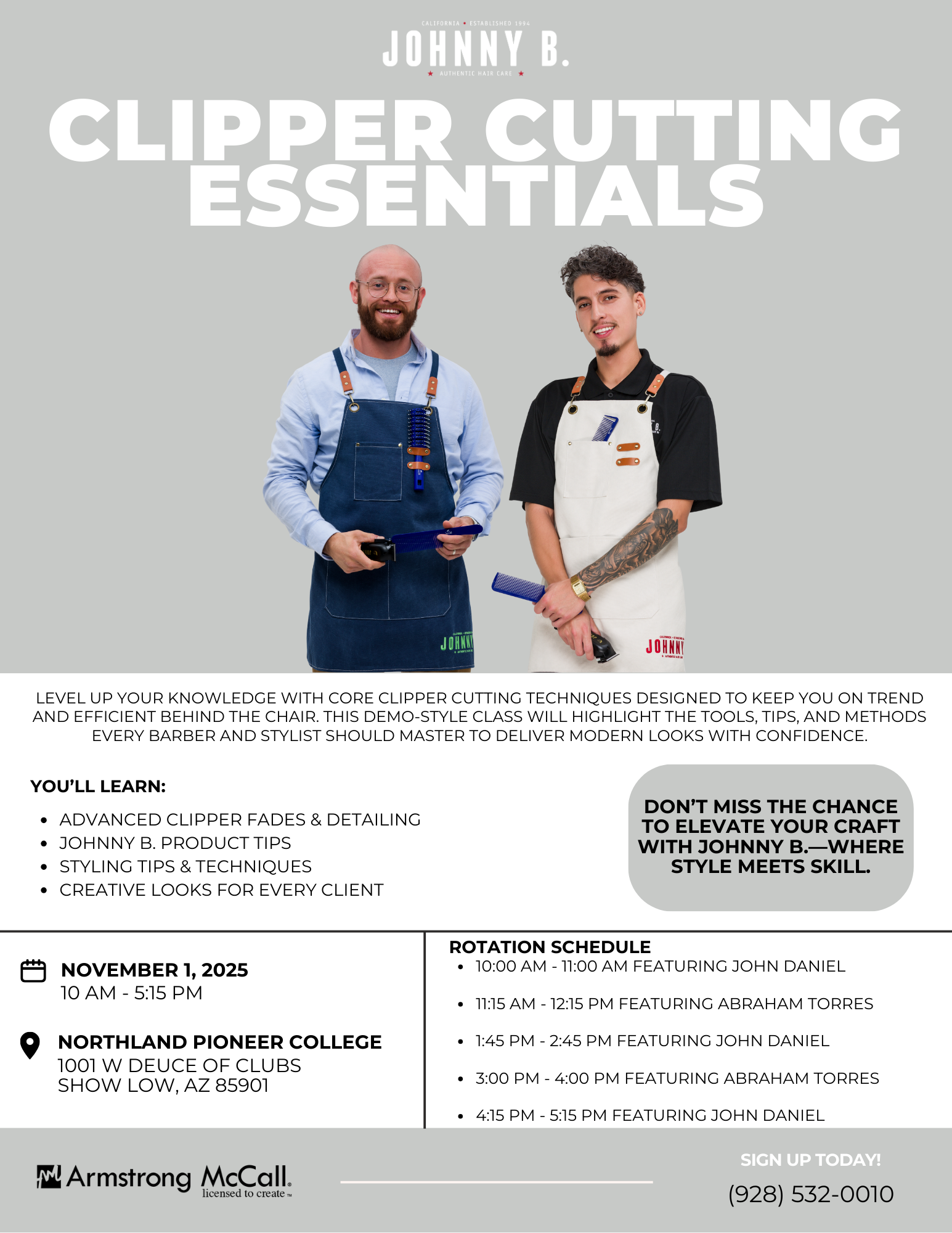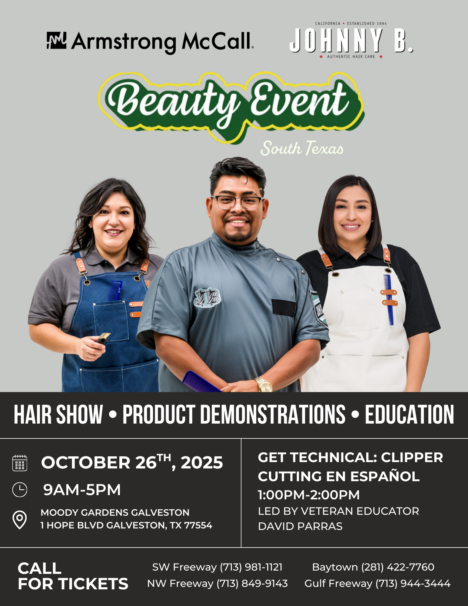 SHOWS & EXPOS Where will Johnny Be? Want to meet the Johnny B. team in person? Here’s where we’ll be in the weeks to come. AMCO Galveston Hair Show October 26, 2025 9am – 5pm Moody Gardens1 Hope Blvd, Galveston, TX 77554 Booth #204 TICKETS FLYER White Mountain Educational Show November 1-2, 2025 10am – 5:15pm Northland Pioneer College 1001 W Deuce of Clubs, Show Low, AZ 85901 TICKETS FLYER Beam City Hair Festival November 16, 2025 American Royal Palace1915 West Thunderbird Road Phoenix, AZ 85029 Booth #33 TICKETS